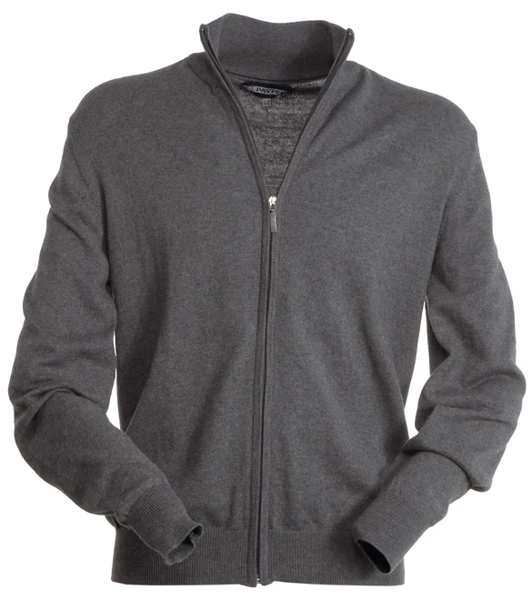 Full zip unisex jumper with finely rib cuffs and bottom edges, elbow patches, in stocking stitch and fully fashioned without seams