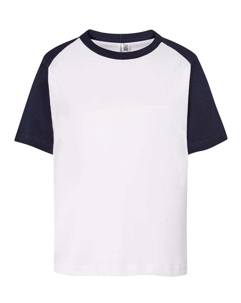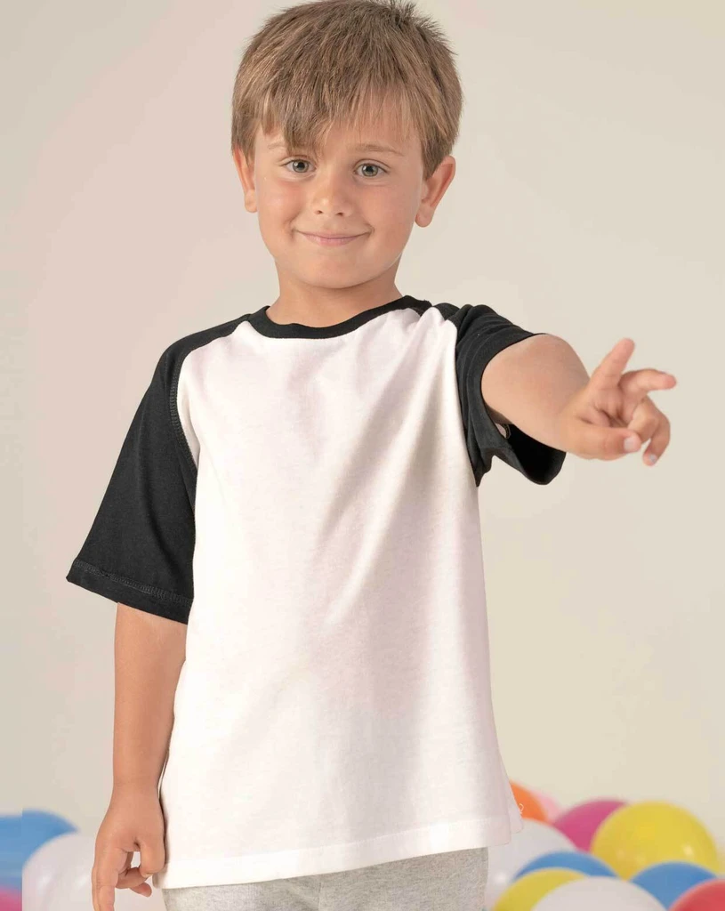 Baseball t-shirt for boys with short sleeves and collar in contrast with side seams, 100% cotton. Removable label. Available in 5 colors.