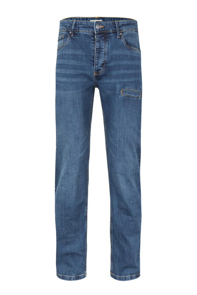 Seven pockets: 2 front pockets, 1 watch pocket, 2 back patch pockets, 1 front left leg with 1 pocket for mobile phone or tools, 1 mobile phone or tool pocket on the back of the right leg