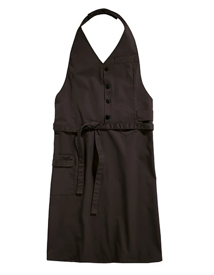 This waistcoat apron is a clever combination of elegant and practical. Thanks to its clever cut, the one-size-fits-all apron will fit all the members of your team. The top has four decorative buttons, and the neck tie has three buttons to adjust the length. The apron is tied with apron ties at the waist. A patch pocket on the side (17x19 cm) with two compartments offers sufficient storage space for work materials. The special touch are the sewn-on loops that are used to hang the serving cloth from. 95ºC washable, crease-resistant, easy-care, colourfast, industrial laundering, finishing allowed.