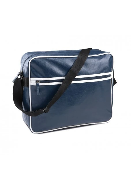 Messenger fashion bag in PVC, contrast color trimming and adjustable shoulder straps, front pocket with zip, metal gun finishing accessories. SBS zips.