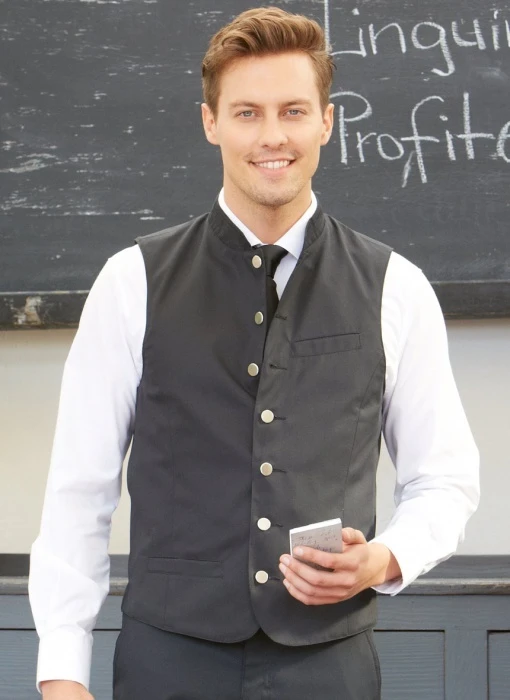 The dividing seams in the front and back of these slim-fit waistcoat ensure its marvellous fit. With quilted mandarin collar, three piped pockets and small side slits. The width can be adjusted in the back with a strap. The men’s waistcoat is rounded in the front. The waistcoat is delivered with standard removable, black buttons. Replacement buttons in matt silver are available separately. 95°C washable, easy-care, colourfast, industrial laundering, finishing allowed.