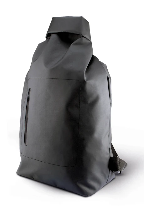 Barrel bag in tarpaulin, top fastening with zip & buckle, adjustable webbing shoulder straps, front pocket with waterproof zip. SBS zips.