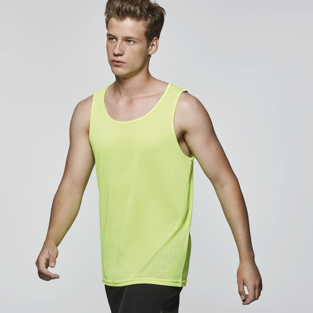 Wide straps t-shirt in microperforated fabric. Round neck and armholes ribbed in the same fabric. Breathable, lightweight and comfortable touch.