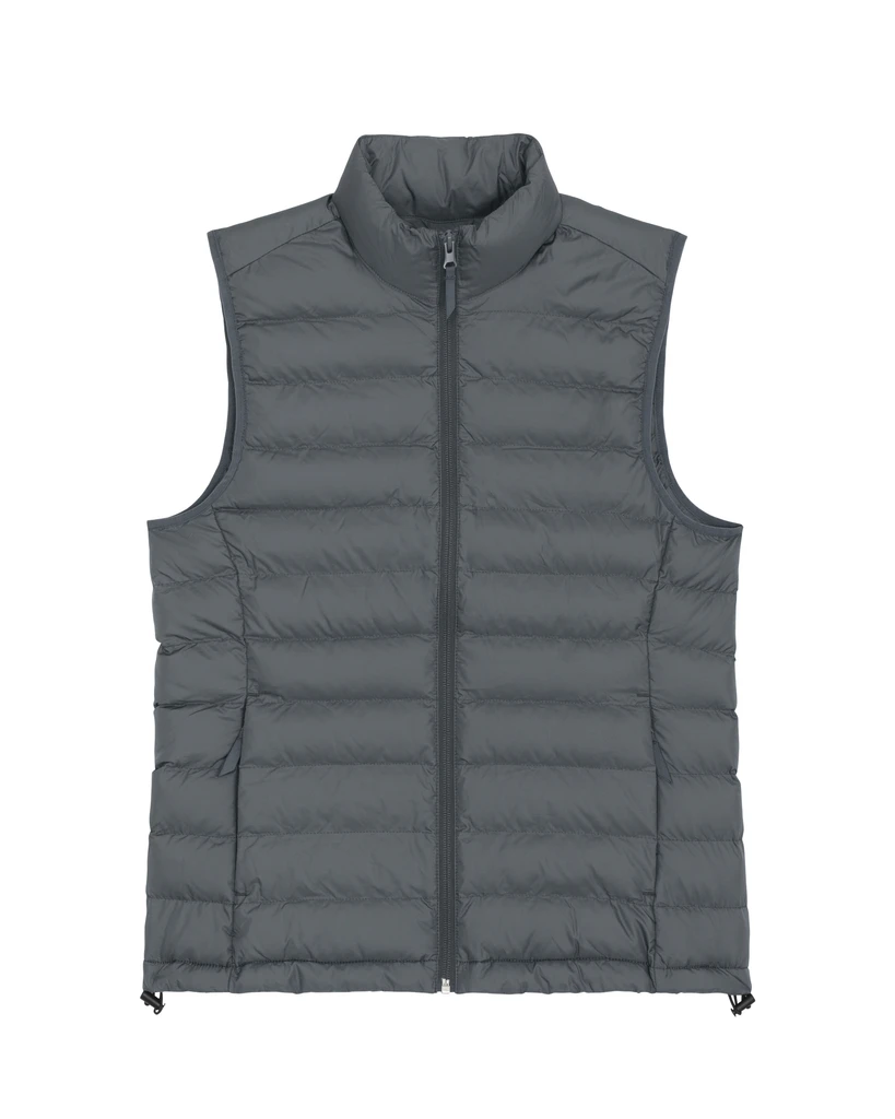 Material: 100% Recycled polyester, Fluorine-free DWR; Weight: 75gsm; Fitted cut, sleeveless, high collar, reverse nylon zip at center front, zipped welt pockets with extra grosgrain puller, elastic tape binding at armhole, fully quilted, side pannels for better shape, inside bound seams, bottom hem with adjustable plastic stopper and elastic cord; Certificates: Global Recycled Standard (GRS), Fair Wair, STANDARD 100 by OEKO-TEX®, Peta - Approved VEGAN