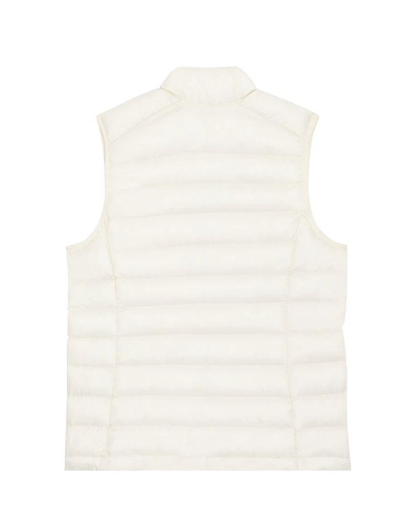 Material: 100% Recycled polyester, Fluorine-free DWR; Weight: 75gsm; Fitted cut, sleeveless, high collar, reverse nylon zip at center front, zipped welt pockets with extra grosgrain puller, elastic tape binding at armhole, fully quilted, side pannels for better shape, inside bound seams, bottom hem with adjustable plastic stopper and elastic cord; Certificates: Global Recycled Standard (GRS), Fair Wair, STANDARD 100 by OEKO-TEX®, Peta - Approved VEGAN