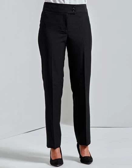 A straight leg trouser for women that features a deep waistband with crossover tab and with two button fastening. Available in two leg lengths, this is great all round uniform trouser.