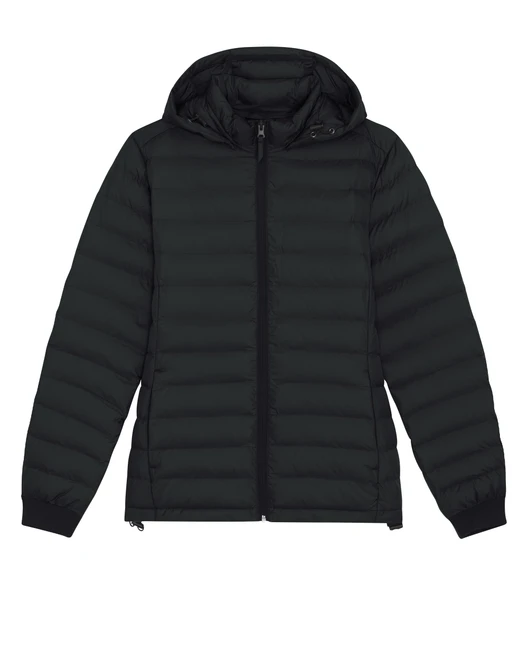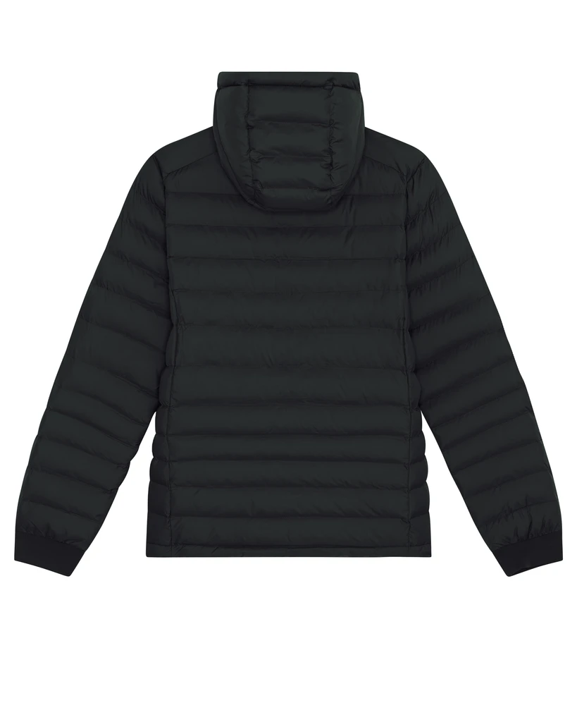 Material: 100% Recycled polyester , Fluorine-free DWR; Weight: 75gsm; Fitted cut, set-in sleeve, high collar with detachable hood and matte metal hidden snaps, hood opening and bottom hem with adjustable plastic stopper and elastic cord, reverse nylon zip at center front, zipped welt pockets with extra grosgrain puller, fully quilted, side panels for better shape, 1x1 rib at sleeve hem, inside bound seams; Certificates: Global Recycled Standard (GRS), Fair Wair, STANDARD 100 by OEKO-TEX®, Peta - Approved VEGAN