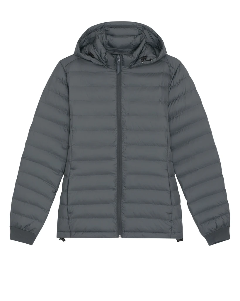 Material: 100% Recycled polyester , Fluorine-free DWR; Weight: 75gsm; Fitted cut, set-in sleeve, high collar with detachable hood and matte metal hidden snaps, hood opening and bottom hem with adjustable plastic stopper and elastic cord, reverse nylon zip at center front, zipped welt pockets with extra grosgrain puller, fully quilted, side panels for better shape, 1x1 rib at sleeve hem, inside bound seams; Certificates: Global Recycled Standard (GRS), Fair Wair, STANDARD 100 by OEKO-TEX®, Peta - Approved VEGAN