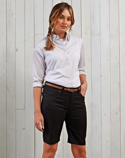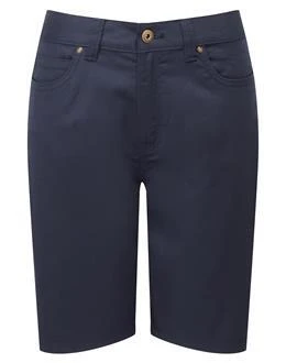 Based on our popular chino jeans, these women's chino shorts are styled with a covered zip-fly fastening and button to the waistband. There loops on the waistband to facilitate a belt, two side pockets with rivet detail and two patch pockets to the reverse. Finished with a double turned hem, these chino shorts are a great option for the warmer months and offer a more casual and playful approach to corporate dressing. A touch of elastane through the fabric gives an element of stretch for maximum comfort.