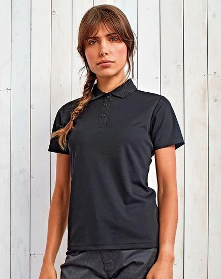 A women's short sleeve polo shirt that is made from recycled polyester with a production method of spun dyeing the yarns. Moisture management properties to the fabric guarantee a breathable and wicking performance, so the wearer stays fresh and cool. Styled with a ribbed collar, three button placket and side vents.