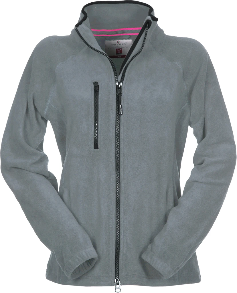 Women’s fitted fleece, with black plastic 8 mm zip, raglan sleeves, adjustable drawstring at the waist, elasticated cuffs, two pockets with concealed zip, one front zip pocket, neck with contrasting reinforcement tape, reinforced seams