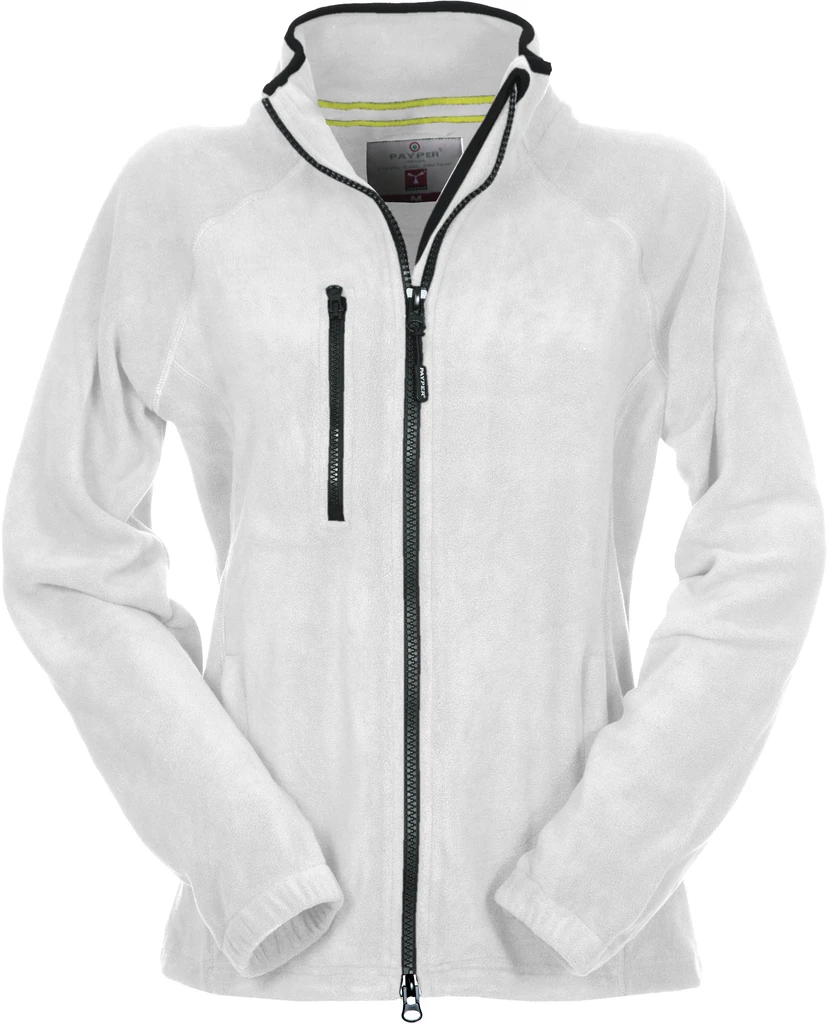 Women’s fitted fleece, with black plastic 8 mm zip, raglan sleeves, adjustable drawstring at the waist, elasticated cuffs, two pockets with concealed zip, one front zip pocket, neck with contrasting reinforcement tape, reinforced seams