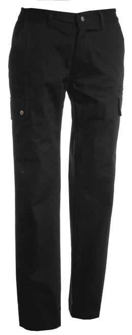 Women’s classic summer trousers with side elastic and waist belt loops. Zip fastening with metal button, two front pockets, two side pockets with flaps and snap fasteners, one left zip pocket, one foldaway tape measure pocket on the right, two slit back pockets with button and buttonhole