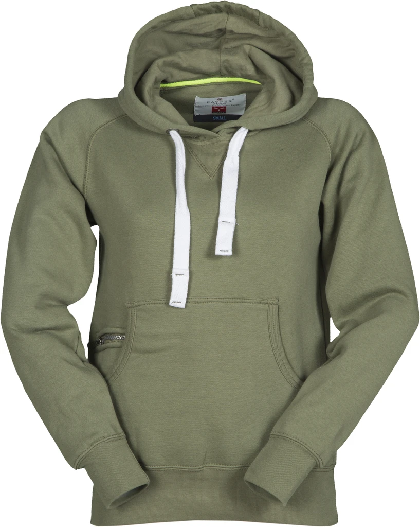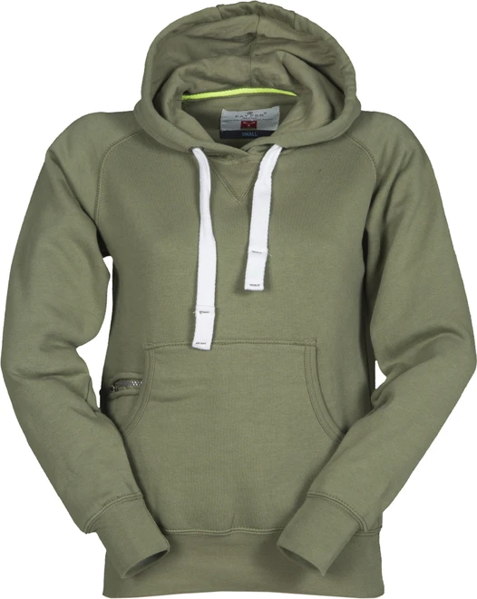 Women’s fitted hoodie with double stitched seams and white drawstring with contrasting stitching and metal rings, raglan sleeves, V-design neck stitching, kangaroo pockets, small zip pocket, stretch rib cuffs and hem, reinforced seams