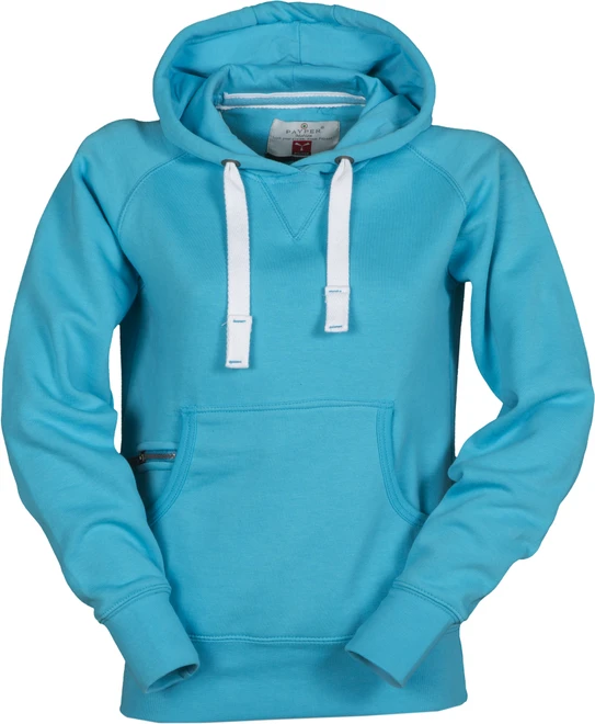 Women’s fitted hoodie with double stitched seams and white drawstring with contrasting stitching and metal rings, raglan sleeves, V-design neck stitching, kangaroo pockets, small zip pocket, stretch rib cuffs and hem, reinforced seams
