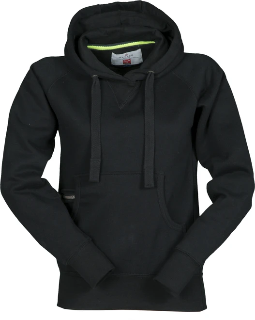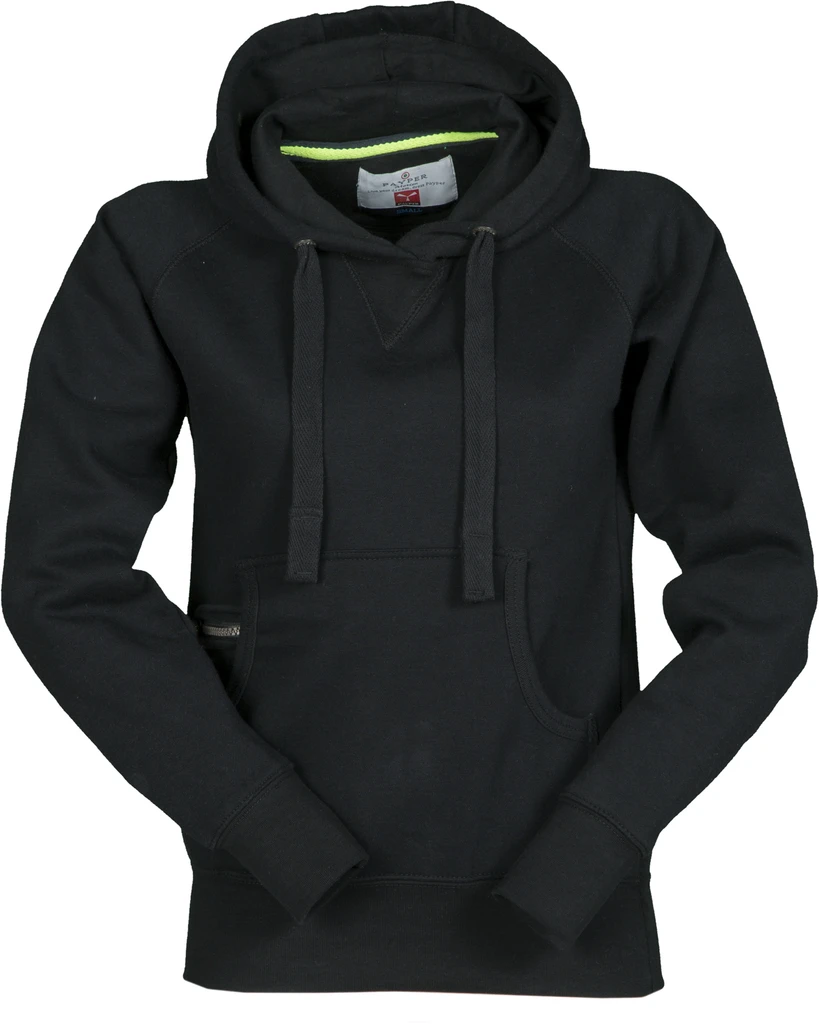 Women’s fitted hoodie with double stitched seams and white drawstring with contrasting stitching and metal rings, raglan sleeves, V-design neck stitching, kangaroo pockets, small zip pocket, stretch rib cuffs and hem, reinforced seams