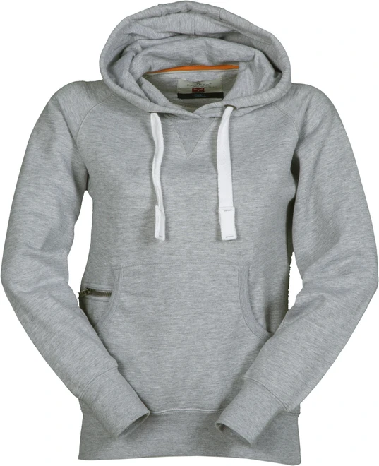 Women’s fitted hoodie with double stitched seams and white drawstring with contrasting stitching and metal rings, raglan sleeves, V-design neck stitching, kangaroo pockets, small zip pocket, stretch rib cuffs and hem, reinforced seams