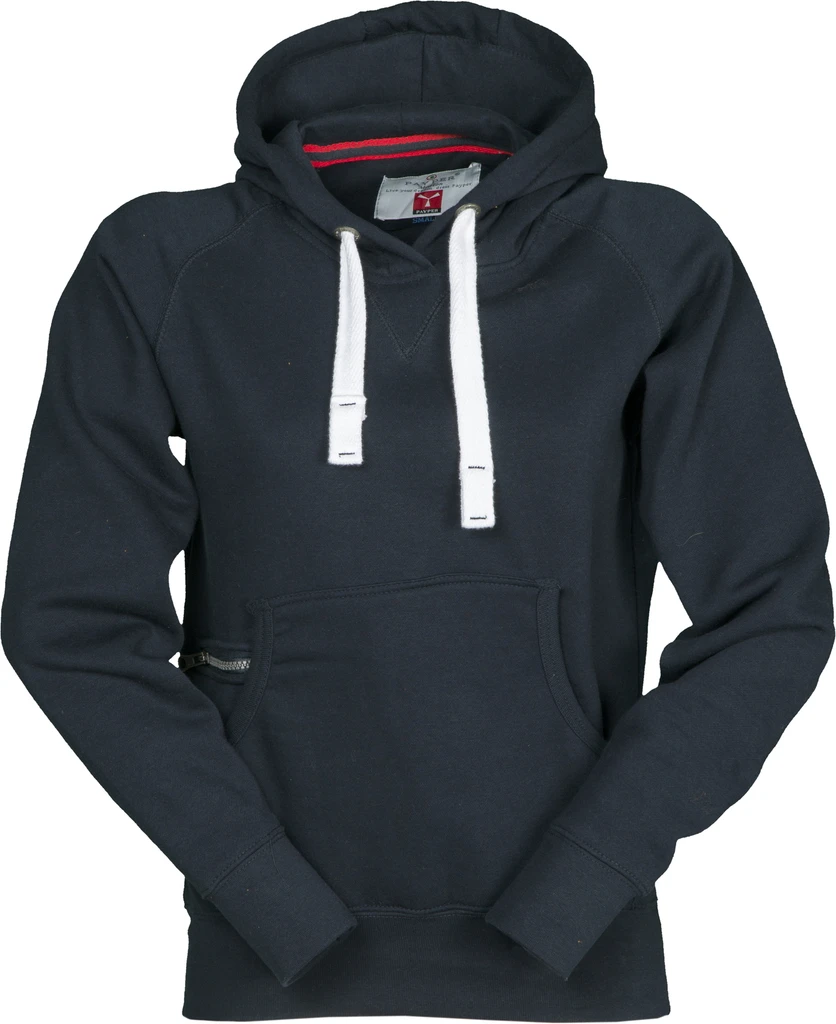 Women’s fitted hoodie with double stitched seams and white drawstring with contrasting stitching and metal rings, raglan sleeves, V-design neck stitching, kangaroo pockets, small zip pocket, stretch rib cuffs and hem, reinforced seams