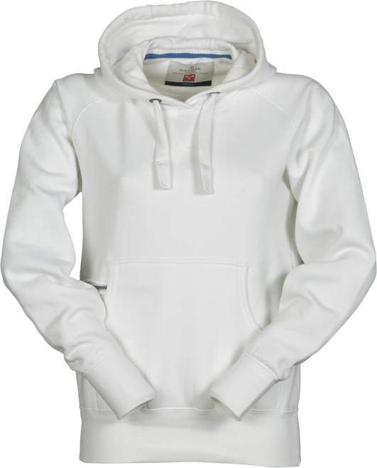Women’s fitted hoodie with double stitched seams and white drawstring with contrasting stitching and metal rings, raglan sleeves, V-design neck stitching, kangaroo pockets, small zip pocket, stretch rib cuffs and hem, reinforced seams