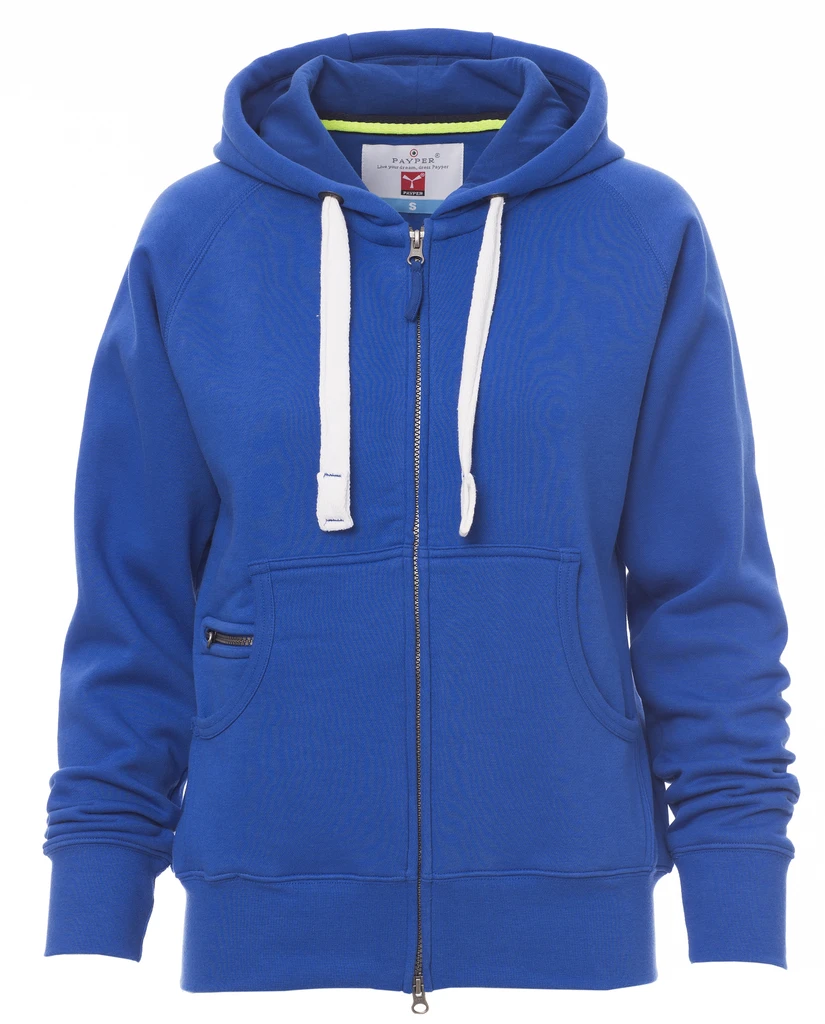 Women’s fitted hoodie with full, plastic-covered SBS zip with double metal pull, hood with double stitched seams and white drawstring with contrasting stitching and metal rings, raglan sleeves, kangaroo pockets, small zip pocket, stretch rib cuffs and hem, reinforced seams