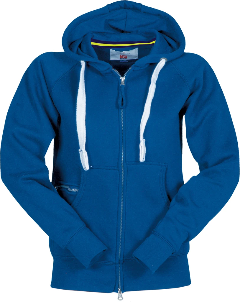 Women’s fitted hoodie with full, covered SBS zip with double metal pull, hood with double stitched seams and white drawstring with contrasting stitching and metal rings, raglan sleeves, kangaroo pockets, small zip pocket, stretch rib cuffs and hem, reinforced seams