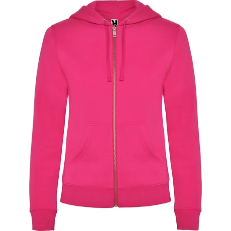Woman´s hoodie with hood lined to tone. Front metal zip and kangaroo pocket. Reinforced covered seams in collar. 2x2 rib knit in cuffs and waist. Fitted cut.