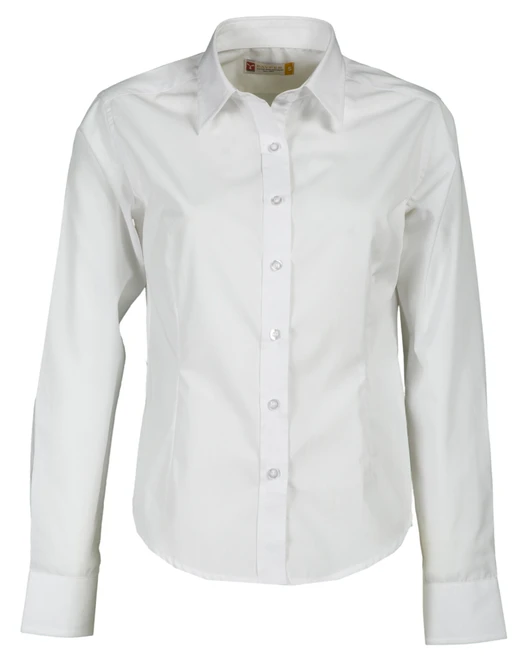 Women’s fine weave combed cotton fitted shirt, pleats at the front and back, Italian-style collar, tailored cuff with 2 buttons and button hole, stitched placket with matching buttons, with yoke
