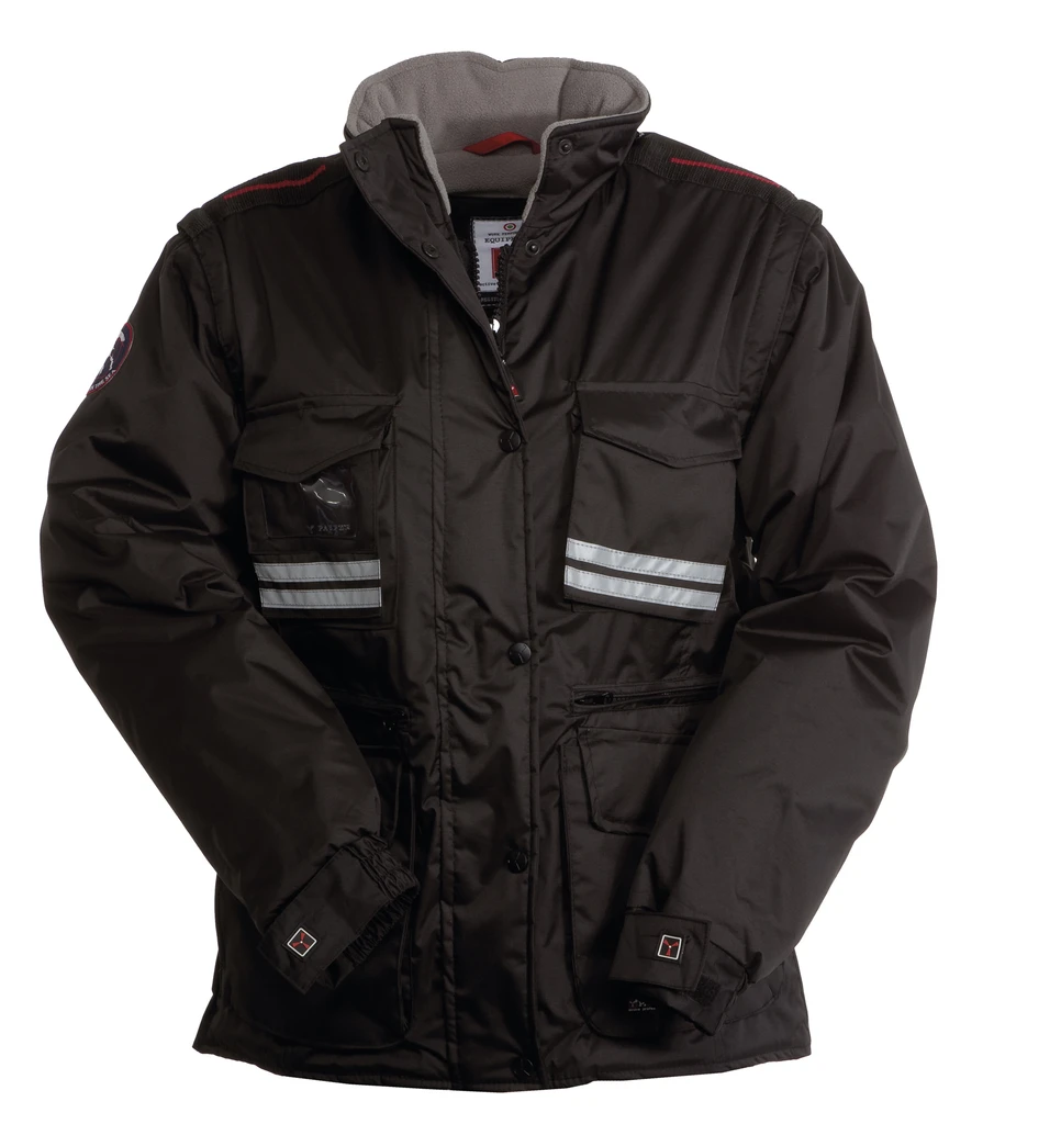 Women’s comfort-fit jacket with detachable sleeves, 8 mm plastic zip with metal pull, with flap fastening and plastic buttons, detachable and/or foldaway shaped hood, adjustable cuffs, grey reflective stripes on the front and back, pre-shaped elbows and side vent with gusset and zip, nine outer pockets, two with LOCK SYSTEM, two with zip and reinforced inner, one with a reversible badge holder. Padded, micro-fleece inside collar, back and lower back warmer, breathable underarm inserts, inner drawstring and zip for easier printing and embroidery