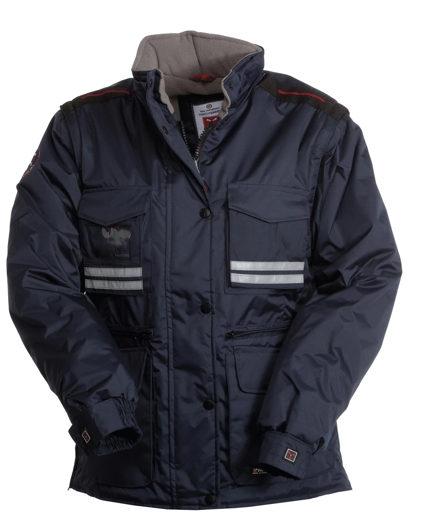Women’s comfort-fit jacket with detachable sleeves, 8 mm plastic zip with metal pull, with flap fastening and plastic buttons, detachable and/or foldaway shaped hood, adjustable cuffs, grey reflective stripes on the front and back, pre-shaped elbows and side vent with gusset and zip, nine outer pockets, two with LOCK SYSTEM, two with zip and reinforced inner, one with a reversible badge holder. Padded, micro-fleece inside collar, back and lower back warmer, breathable underarm inserts, inner drawstring and zip for easier printing and embroidery