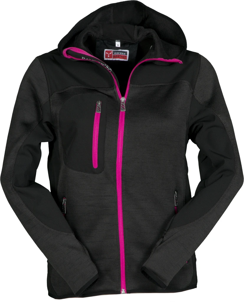 Women’s comfort-fit jacket, long taped SBS zip, shaped hood with double stitched seams, thin-edge cuffs and hem, two side pockets with zip, one breast pocket; knit detail with inserts in black softshell