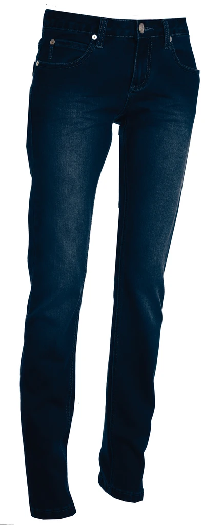 Women’s jeans with five pockets, metal zip fastening with button, belt loops at waist, stone wash, worn, faded effect, contrasting heavy duty stitching, double seams on inside leg, straight leg, studs and patches in real leather