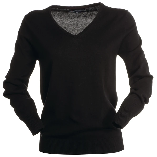 Women’s V neck jumper with fine rib collar, cuffs and hem, in stocking stitch and fully fashioned without seams.