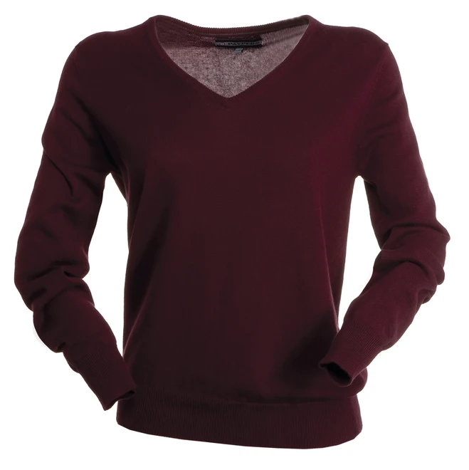 Women’s V neck jumper with fine rib collar, cuffs and hem, in stocking stitch and fully fashioned without seams.