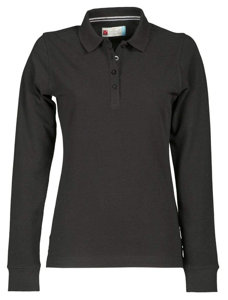Women’s long-sleeved fitted polo shirt with 4, matching, mother-of-pearl effect buttons, rib collar and sleeve edging, side vents, concealed collar stitching with contrasting tape, stretch seams,