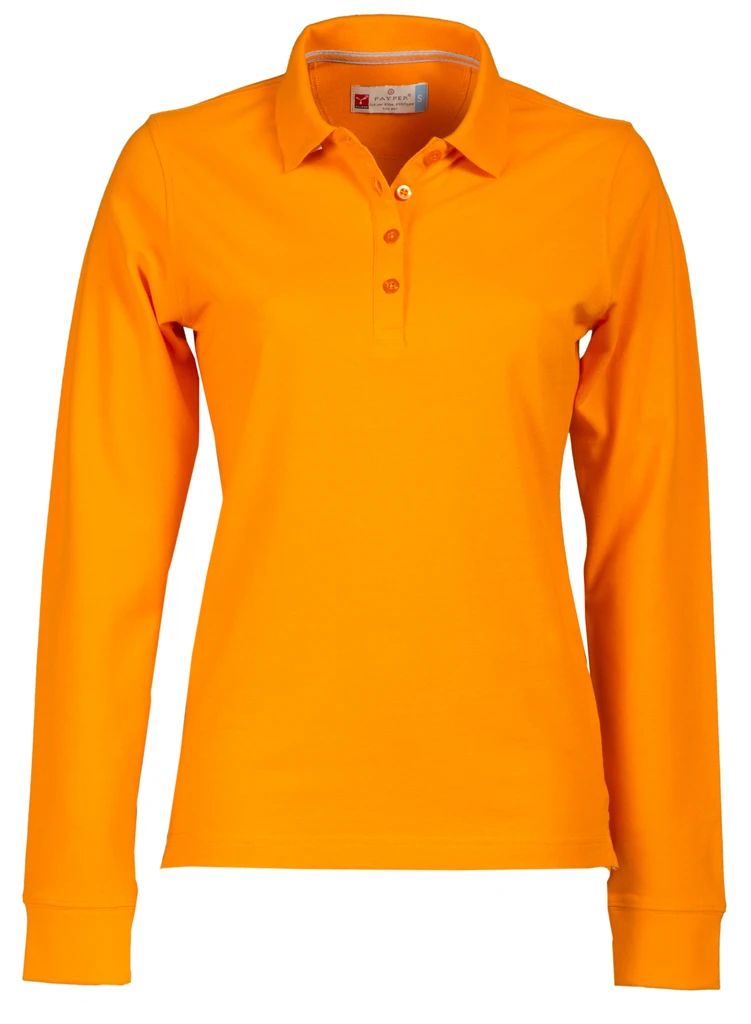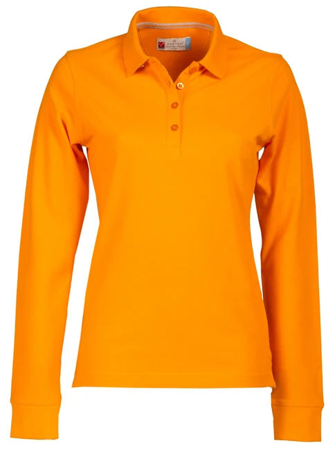 Women’s long-sleeved fitted polo shirt with 4, matching, mother-of-pearl effect buttons, rib collar and sleeve edging, side vents, concealed collar stitching with contrasting tape, stretch seams,