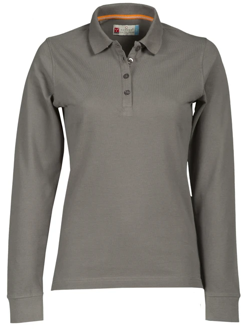 Women’s long-sleeved fitted polo shirt with 4, matching, mother-of-pearl effect buttons, rib collar and sleeve edging, side vents, concealed collar stitching with contrasting tape, stretch seams,