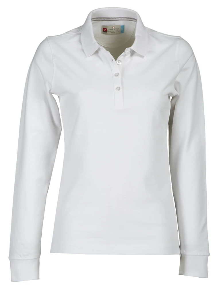 Women’s long-sleeved fitted polo shirt with 4, matching, mother-of-pearl effect buttons, rib collar and sleeve edging, side vents, concealed collar stitching with contrasting tape, stretch seams,
