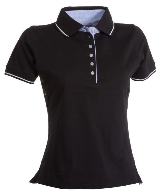 Women’s short-sleeved fitted polo shirt with 6 white buttons, inside collar, flap and side vents in Oxford blue, rib collar and sleeve edging with fine contrasting trim, underarm eyelets, side vents with