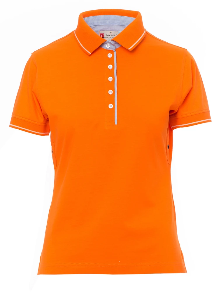 Women’s short-sleeved fitted polo shirt with 6 white buttons, inside collar, flap and side vents in Oxford blue, rib collar and sleeve edging with fine contrasting trim, underarm eyelets, side vents with