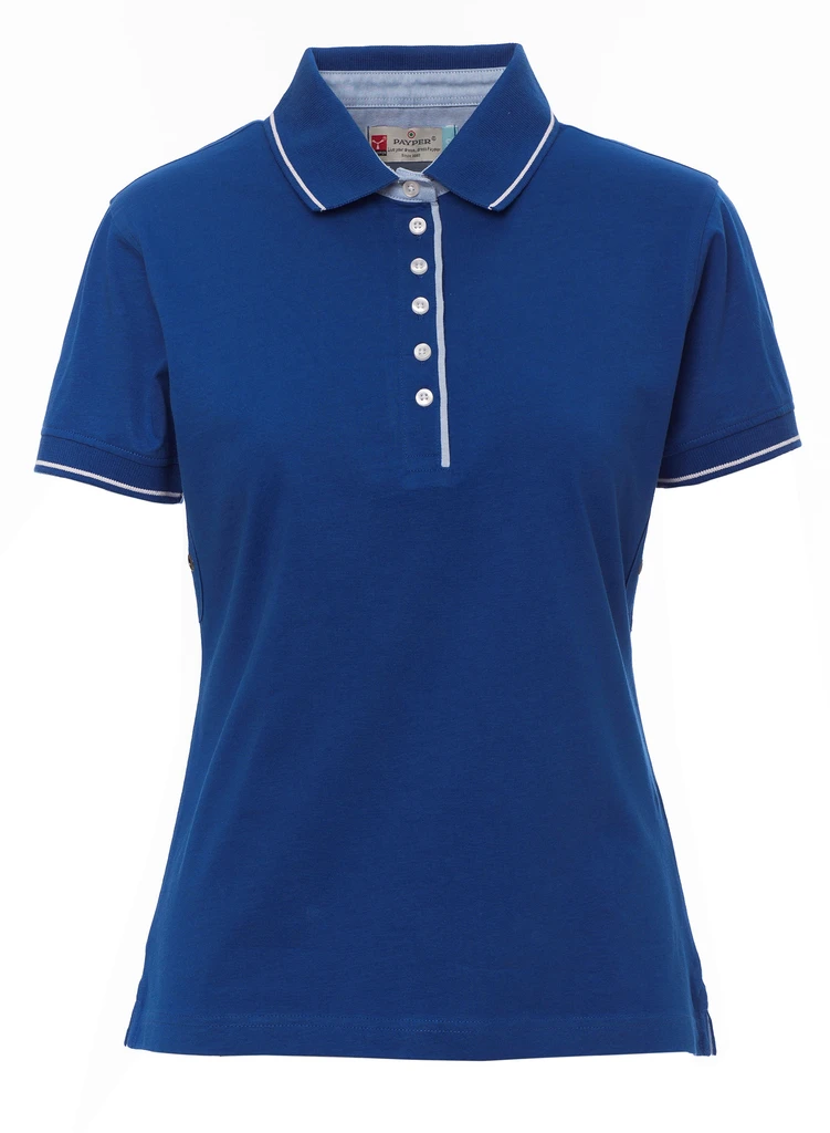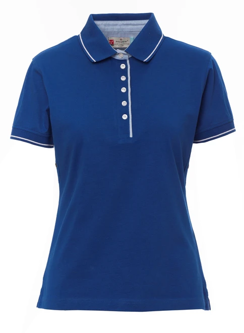 Women’s short-sleeved fitted polo shirt with 6 white buttons, inside collar, flap and side vents in Oxford blue, rib collar and sleeve edging with fine contrasting trim, underarm eyelets, side vents with