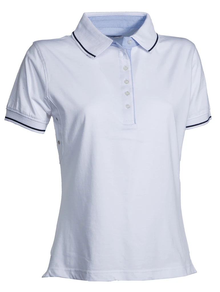 Women’s short-sleeved fitted polo shirt with 6 white buttons, inside collar, flap and side vents in Oxford blue, rib collar and sleeve edging with fine contrasting trim, underarm eyelets, side vents with