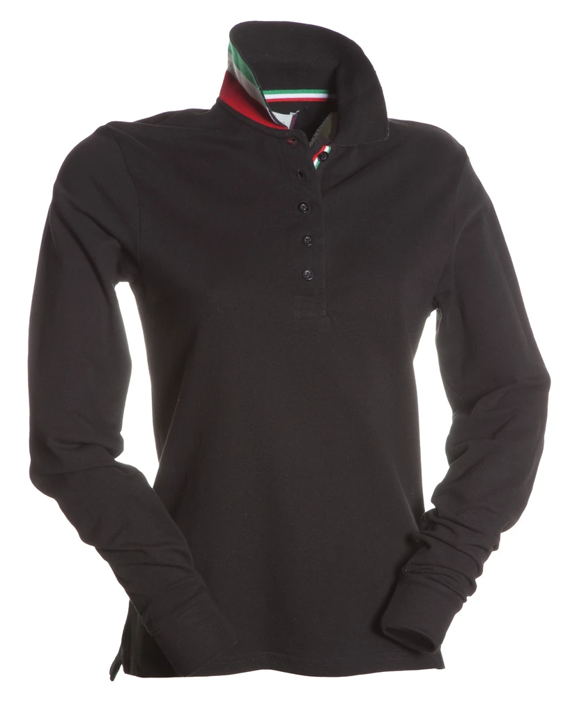 Women’s long-sleeved fitted polo shirt with 5, matching, mother-of-pearl effect buttons, matching collar, with contrasting underside (colours of the flag). Inner button flap and side vents with colours of the flag, rib collar and cuffs, concealed collar stitching, side reinforcement tape
