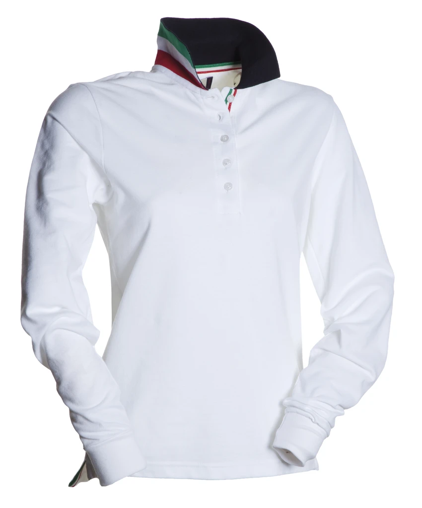 Women’s long-sleeved fitted polo shirt with 5, matching, mother-of-pearl effect buttons, matching collar, with contrasting underside (colours of the flag). Inner button flap and side vents with colours of the flag, rib collar and cuffs, concealed collar stitching, side reinforcement tape