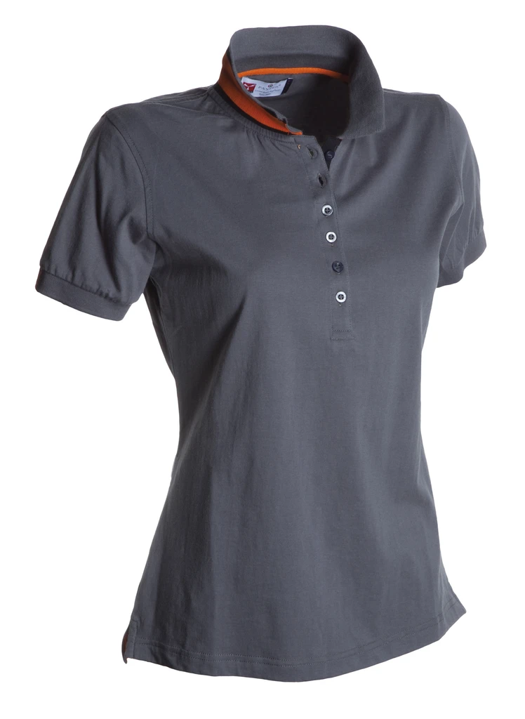 Women’s short-sleeved fitted polo shirt with 6, matching, mother-of-pearl effect buttons, matching collar with contrasting colour underside; contrasting inner button flap and side vents, right sleeve edging with colour trim (same colour as collar), rib sleeve edging, concealed collar stitching with contrasting tape, side reinforcement tape, inner neck tape