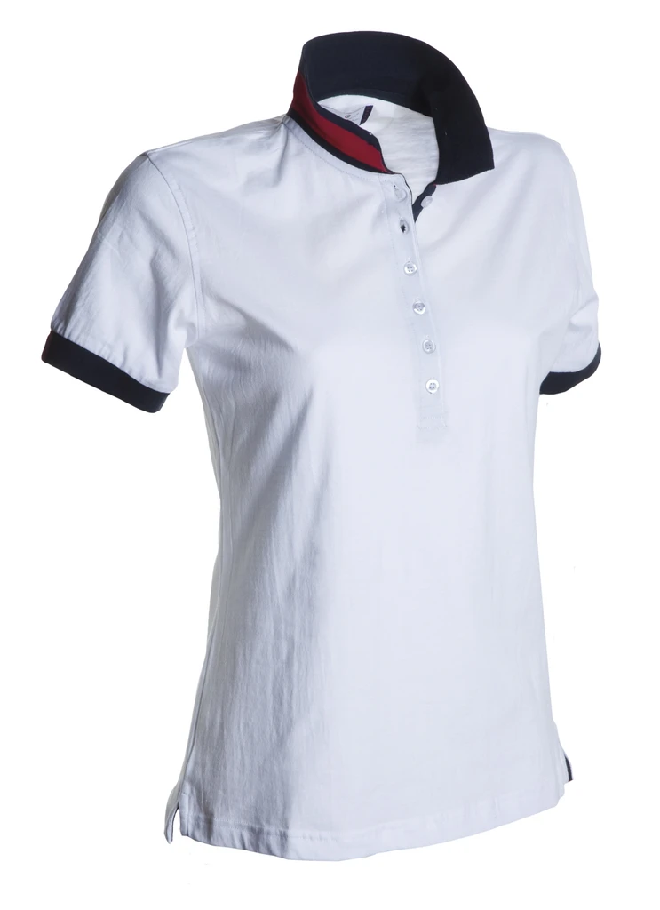 Women’s short-sleeved fitted polo shirt with 6, matching, mother-of-pearl effect buttons, matching collar with contrasting colour underside; contrasting inner button flap and side vents, right sleeve edging with colour trim (same colour as collar), rib sleeve edging, concealed collar stitching with contrasting tape, side reinforcement tape, inner neck tape