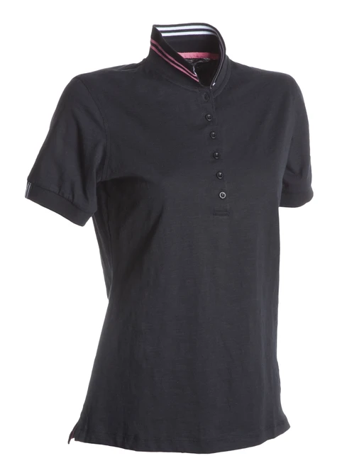 Women’s short-sleeved fitted polo shirt with 6, matching, mother-of-pearl effect buttons, collar with contrasting stripes and fluorescent stripes on the underside, rib collar and sleeve edging, right sleeve with insert, side vents and concealed collar stitching with fluo tape, transfer label