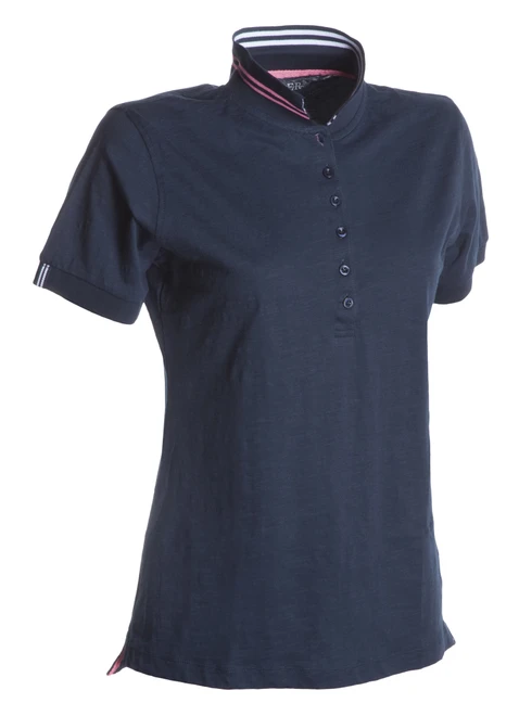 Women’s short-sleeved fitted polo shirt with 6, matching, mother-of-pearl effect buttons, collar with contrasting stripes and fluorescent stripes on the underside, rib collar and sleeve edging, right sleeve with insert, side vents and concealed collar stitching with fluo tape, transfer label
