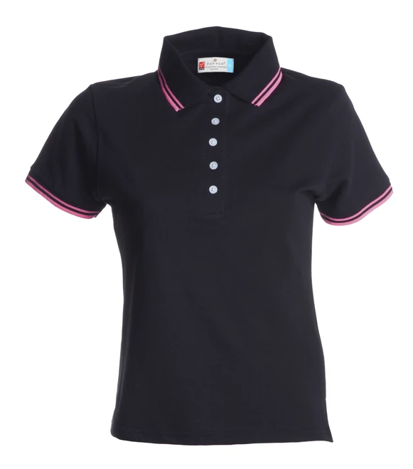 Women’s short-sleeved fitted polo shirt with 5 white buttons, fine contrasting collar and sleeve trim, rib collar and sleeve edging, side vents with reinforced seams, concealed collar stitching, side reinforcement tape, stretch seams, inner neck tape