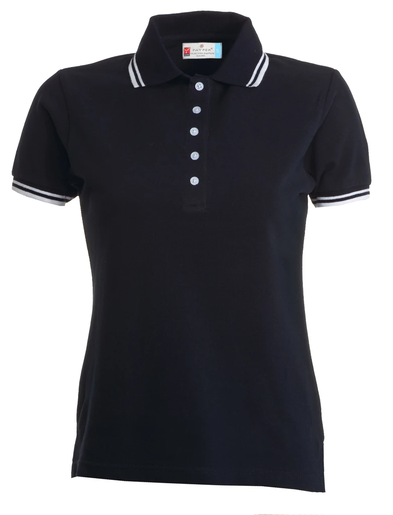 Women’s short-sleeved fitted polo shirt with 5 white buttons, fine contrasting collar and sleeve trim, rib collar and sleeve edging, side vents with reinforced seams, concealed collar stitching, side reinforcement tape, stretch seams, inner neck tape